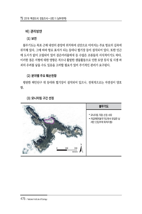 2018 특정도서 정밀조사 신안 1 남부권역 476 ? National Institute of Ecology 1 불무기도는 목포 근해 내만의 중앙에 위치하여 신안으로 이어지는 주요 항로의 길목에 위치해 있다. 그에 따라 항로 표지가 되는 등대나 헬기장 등이 설치되어 있다. 또한 인근 에 도서가 없이 고립되어 있어 검은머리물떼새 등 수많은 조류들의 서식처이기도 하다. 이러한 점은 지형에 대한 영향은 적으나 활발한 생물활동으로 인한 토양 침식 및 식생 파 괴의 우려를 낳을 수도 있음을 고려할 필요가 있어 주기적인 관리가 요구된다. 2 평탄한 해안단구 위 등대와 헬기장이 설치되어 있으나, 전체적으로는 자연성이 양호 함. 3 불무기도 * 모니터링 지점 선정 사유 자갈해안 불무기도에서 유일한 남 서안 만입부의 퇴적지...
