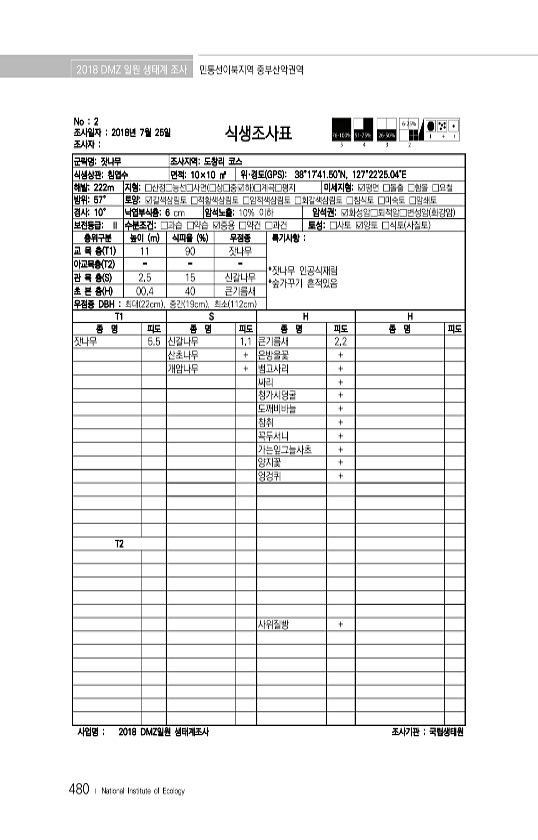 2018 DMZ 일원 생태계 조사 민통선이북지역 중부산악권역 480 ? National Institute of Ecology No 2 조사일자 2018년 7월 25일 조사자 식생조사표 군락명잣나무 조사지역도창리 코스 식생상관침엽수 면적10×10 ㎡ 위·경도 GPS 38°1741.50N, 127°2225.04E 해발222m 지형□산정□능선□사면 □상□중?하 □계곡□평지 미세지형?평면 □돌출 □함몰 □요철 방위57° 토양?갈색삼림토 □적황색삼림토 □암적색삼림토 □회갈색삼림토 □침식토 □미숙토 □암쇄토 경사10° 낙엽부식층6 cm 암석노출10% 이하 암석권?화성암□퇴적암□변성암 화강암 보전등급Ⅱ 수분조건□과습 □약습 ?중용 □약건 □과건 토성□사토 ?양토 □식토 사질토 층위구분 높이 m 식피율 % 우점종 특기사항...