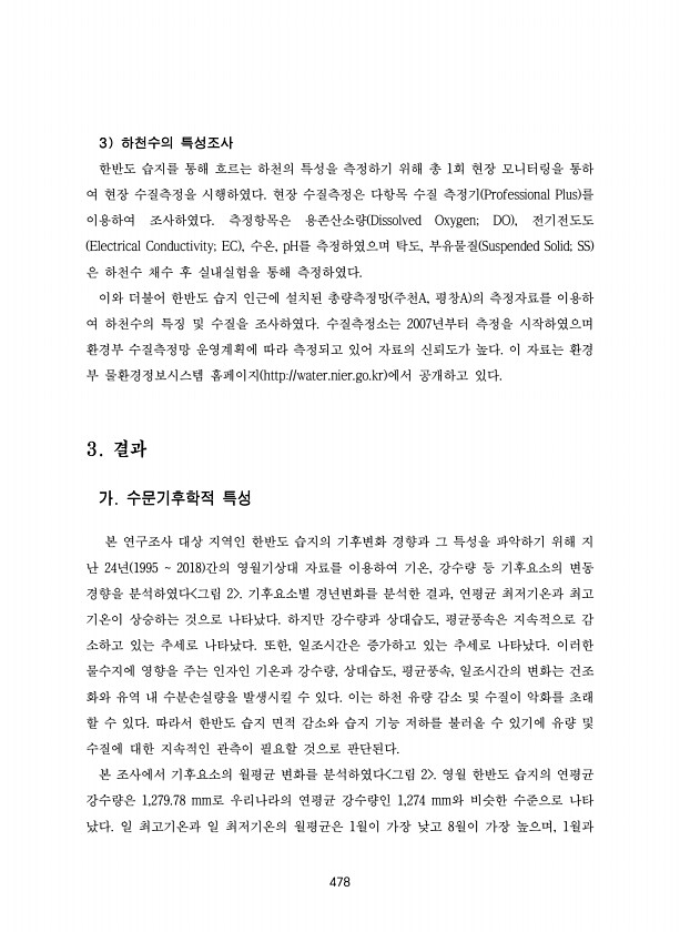 478 3 하천수의 특성조사 한반도 습지를 통해 흐르는 하천의 특성을 측정하기 위해 총 1회 현장 모니터링을 통하 여 현장 수질측정을 시행하였다. 현장 수질측정은 다항목 수질 측정기 Professional Plus 를 이용하여 조사하였다. 측정항목은 용존산소량 Dissolved Oxygen; DO , 전기전도도 Electrical Conductivity; EC , 수온, pH를 측정하였으며 탁도, 부유물질 Suspended Solid; SS 은 하천수 채수 후 실내실험을 통해 측정하였다. 이와 더불어 한반도 습지 인근에 설치된 총량측정망 주천A, 평창A 의 측정자료를 이용하 여 하천수의 특징 및 수질을 조사하였다. 수질측정소는 2007년부터 측정을 시작하였으며 환경부 수질측정망 운영계획에 따라 측정되고 있어...
