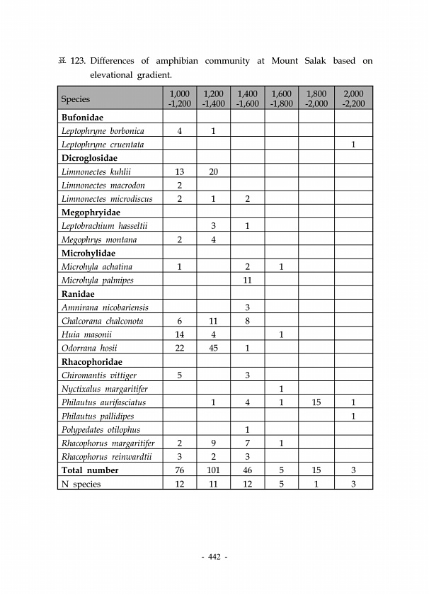 442 Species -1,200 1,000 -1,400 1,200 -1,600 1,400 -1,800 1,600 -2,000 1,800 -2,200 2,000 Bufonidae Leptophryne borbonica 4 1 Leptophryne cruentata 1 Dicroglosidae Limnonectes kuhlii 13 20 Limnonectes macrodon 2 Limnonectes microdiscus 2 1 2 Megophryidae Leptobrachium hasseltii 3 1 Megophrys montana 2 4 Microhylidae Microhyla achatina 1 2 1 Microhyla palmipes 11 Ranidae Amnirana nicobariensis 3 Ch...