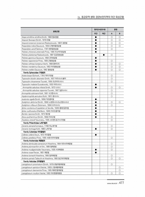 ix. 동강유역 생태·경관보전지역의 야간 육상곤충 www.nie.re.kr ?477 분류군명 현지조사 2018 문헌 주간 야간 A B Vespa simillima simillima Smith, 1868 털보말벌 ● ○ ○ Vespula flaviceps Smith, 1870 땅벌 ● ○ ○ Vespula koreensis koreensis Radoszkowski, 1887 참땅벌 ● ○ ○ Parapolybia indica Saussure, 1854 큰뱀허물쌍살벌 ● ○ ○ Parapolybia varia Fabricius, 1787 뱀허물쌍살벌 ● ○ Polistes chinensis antennalis P?rez, 1905 두눈박이쌍살벌 ● Polistes jokahama...