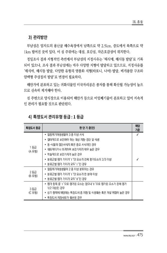 III. 종 합 www.nie.re.kr ?475 3 부남섬은 임자도의 용난굴 해수욕장에서 남쪽으로 약 2.5km, 증도에서 북쪽으로 약 1km 떨어진 곳에 있다. 이 섬 주위에는 대섬, 호감섬, 작은호감섬이 위치한다. 정밀조사 결과 지형적인 측면에서 부남섬의 지정사유는 ‘해식애, 해식동 발달’로 기록 되어 있으나, 조사 결과 부남섬에는 매우 다양한 지형이 발달하고 있으므로, 지정사유를 ‘해식애, 해식동 발달. 다양한 유형의 염풍화 지형 타포니, 나마 발달. 베개용암 구조와 암맥형 주상절리 발달’로 변경이 필요하다. 해안가에 분포하고 있는 귀화식물인 미국자리공은 종자를 통해 확산될 가능성이 높으 므로 신속히 제거해야 한다. 섬 주변으로 양식장으로 이용되어 해안가 등으로 어업폐기물이 분포하고 있어 지속적 인 ...