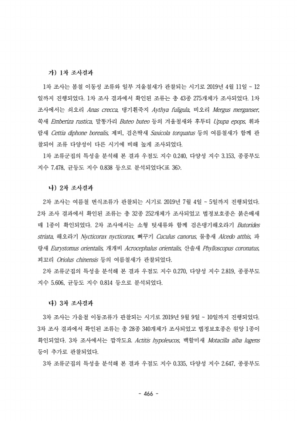 466 1차 조사는 봄철 이동성 조류와 일부 겨울철새가 관찰되는 시기로 년 월 일 2019 4 11 12 일까지 진행되었다 차 조사 결과에서 확인된 조류는 총 종 개체가 조사되었다 차 1 43 275 1 조사에서는 쇠오리 Anas crecca, 댕기흰죽지 Aythya fuligula, 비오리 Mergus merganser, 쑥새 Emberiza rustica, 말똥가리 Buteo buteo 등의 겨울철새와 후투티 Upupa epops, 휘파 람새 Cettia diphone borealis, , 제비 검은딱새 Saxicola torquatus 등의 여름철새가 함께 관 찰되어 조류 다양성이 다른 시기에 비해 높게 조사되었다. 1차 조류군집의 특성을 분석해 본 결과 우점도 지수 다양성 지수 종풍부도 0.240, ...
