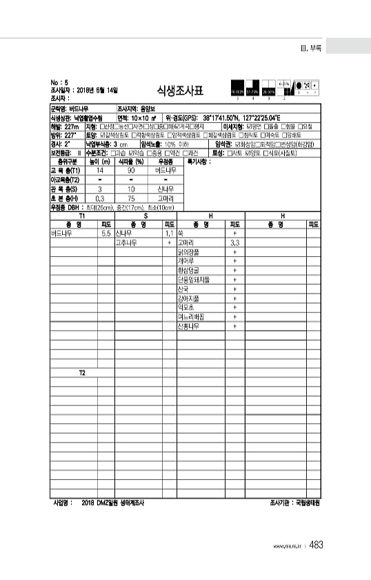 Ⅲ. 부록 www.nie.re.kr ? 483 No 5 조사일자 2018년 5월 14일 조사자 식생조사표 군락명버드나무 조사지역용양보 식생상관낙엽활엽수림 면적10×10 ㎡ 위·경도 GPS 38°1741.50N, 127°2225.04E 해발227m 지형□산정□능선□사면 □상□중□하 ?계곡□평지 미세지형?평면 □돌출 □함몰 □요철 방위227° 토양?갈색삼림토 □적황색삼림토 □암적색삼림토 □회갈색삼림토 □침식토 □미숙토 □암쇄토 경사2° 낙엽부식층3 cm 암석노출10% 이하 암석권?화성암□퇴적암□변성암 화강암 보전등급Ⅱ 수분조건□과습 ?약습 □중용 □약건 □과건 토성□사토 ?양토 □식토 사질토 층위구분 높이 m 식피율 % 우점종 특기사항 교 목 층 T1 14 90 버드나무 아교목층 T2 관 목 층 S 3 10 신...