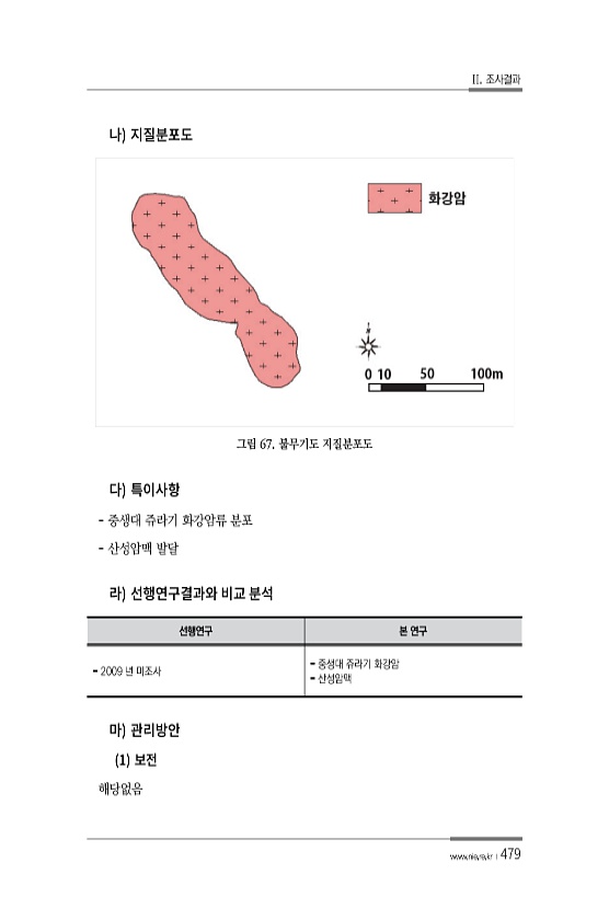 II. 조사결과 www.nie.re.kr ?479 그림 67. 불무기도 지질분포도 중생대 쥬라기 화강암류 분포 산성암맥 발달 선행연구 본 연구 2009 년 미조사 중생대 쥬라기 화강암 산성암맥 1해당없음