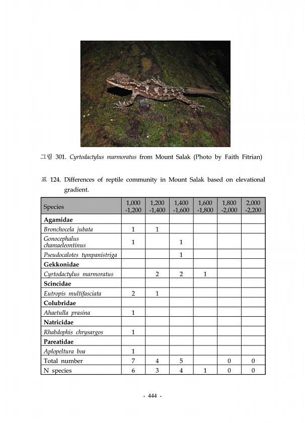444 그림 301. Cyrtodactylus marmoratus from Mount Salak Photo by Faith Fitrian Species -1,200 1,000 -1,400 1,200 -1,600 1,400 -1,800 1,600 -2,000 1,800 -2,200 2,000 Agamidae Bronchocela jubata 1 1 Gonocephalus chamaeleontinus 1 1 Pseudocalotes tympanistriga 1 Gekkonidae Cyrtodactylus marmoratus 2 2 1 Scincidae Eutropis multifasciata 2 1 Colubridae Ahaetulla prasina 1 Natricidae Rhabdophis chrysargos...