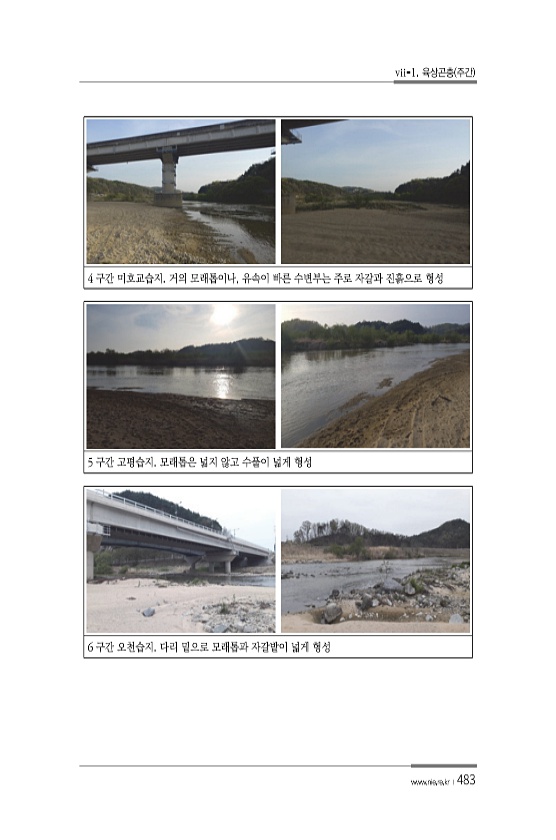 vii-1. 육상곤충 주간 www.nie.re.kr ?483 4 구간 미호교습지. 거의 모래톱이나, 유속이 빠른 수변부는 주로 자갈과 진흙으로 형성 5 구간 고평습지. 모래톱은 넓지 않고 수풀이 넓게 형성 6 구간 오천습지. 다리 밑으로 모래톱과 자갈밭이 넓게형성