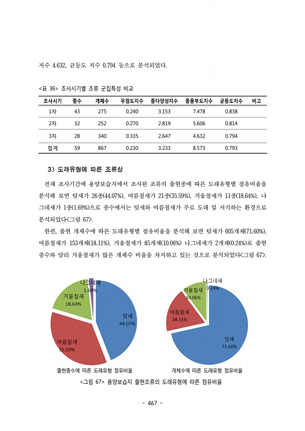 467 지수 균등도 지수 등으로 분석되었다 4.632, 0.794 조사시기 종수 개체수 우점도지수 종다양성지수 종풍부도지수 균등도지수 비고 차1 43 275 0.240 3.153 7.478 0.838 차2 32 252 0.270 2.819 5.606 0.814 차3 28 340 0.335 2.647 4.632 0.794 합계 59 867 0.230 3.233 8.573 0.793 표 36 조사시기별 조류 군집특성 비교 전체 조사기간에 용양보습지에서 조사된 조류의 출현종에 따른 도래유형별 점유비율을 분석해 보면 텃새가 종 여름철새가 종 겨울철새가 종 나 26 44.07% , 21 35.59% , 11 18.64% , 그네새가 종 으로 종수에서는 텃새와 여름철새가 주로 도래 및 서식하는 환경으로 1 1.69% ...