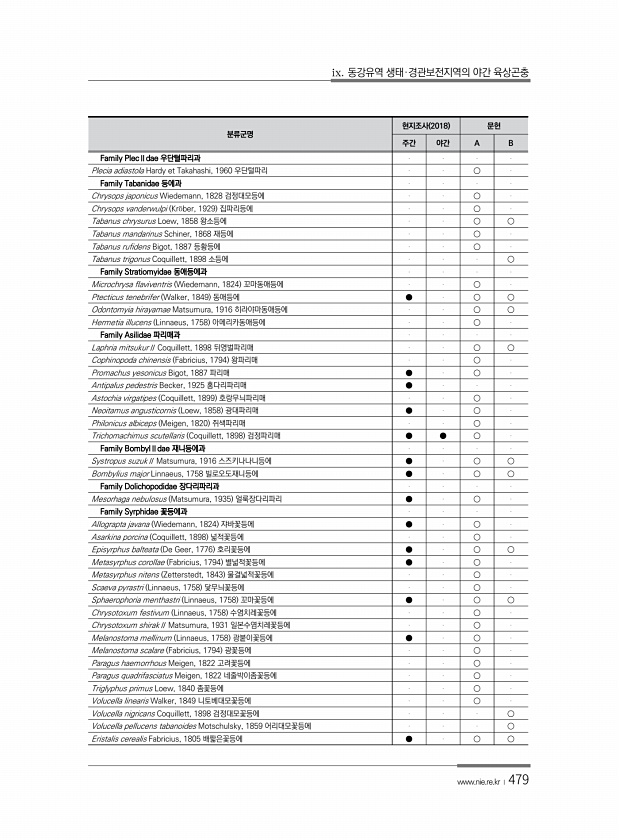 ix. 동강유역 생태·경관보전지역의 야간 육상곤충 www.nie.re.kr ?479 분류군명 현지조사 2018 문헌 주간 야간 A B Family PlecⅡdae 우단털파리과 Plecia adiastola Hardy et Takahashi, 1960 우단털파리 ○ Family Tabanidae 등에과 Chrysops japonicus Wiedemann, 1828 검정대모등에 ○ Chrysops vanderwulpi Kr?ber, 1929 집파리등에 ○ Tabanus chrysurus Loew, 1858 왕소등에 ○ ○ Tabanus mandarinus Schiner, 1868 재등에 ○ Tabanus rufidens Bigot, 1887 등황등에 ○ ...