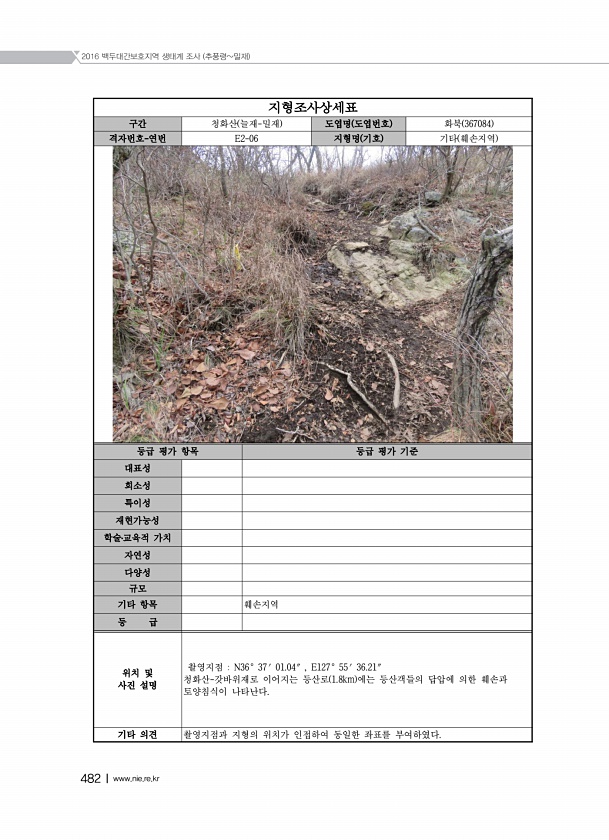 2016 백두대간보호지역 생태계 조사 추풍령밀재 482Ⅰwww.nie.re.kr 지형조사상세표 구간 청화산 늘재-밀재 도엽명 도엽번호 화북 367084 격자번호-연번 E2-06 지형명 기호 기타 훼손지역 등급 평가 항목 등급 평가 기준 대표성 희소성 특이성 재현가능성 학술?교육적 가치 자연성 다양성 규모 기타 항목 훼손지역 등 급 위치 및 사진 설명 촬영지점 N36° 37′ 01.04″ , E127° 55′ 36.21″ 청화산-갓바위재로 이어지는 등산로 1.8km 에는 등산객들의 답압에 의한 훼손과 토양침식이 나타난다. 기타 의견 촬영지점과 지형의 위치가 인접하여 동일한 좌표를부여하였다.