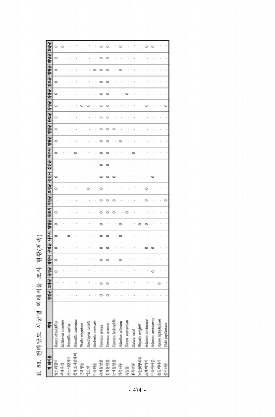표 81. 전라남도 시군별 외래식물 조사 현황 계속 행 레이블 학명 강진군 고흥군 곡성군 광양시 구례군 나주시 담양군 목포시 무안군 보성군 순천시 신안군 여수시 영광군 영암군 완도군 장성군 장흥군 진도군 함평군 해남군 화순군 돌소리쟁이 Rumex obtusifolius 0 0 0 0 0 0 0 0 0 0 0 0 0 0 0 0 0 0 부레옥잠 Eichhornia crassipes 0 개소시랑개비 Potentilla supina 0 좀개소시랑개비 Potentilla amurensis 0 큰백령풀 Diodia virginiana 0 약모밀 Houttuynia cordata 0 0 미국외풀 Lindernia attenuata 0 큰개불알풀 Veronica persica 0 0 0 0 0 0 0 0 0 0 0 0 0...