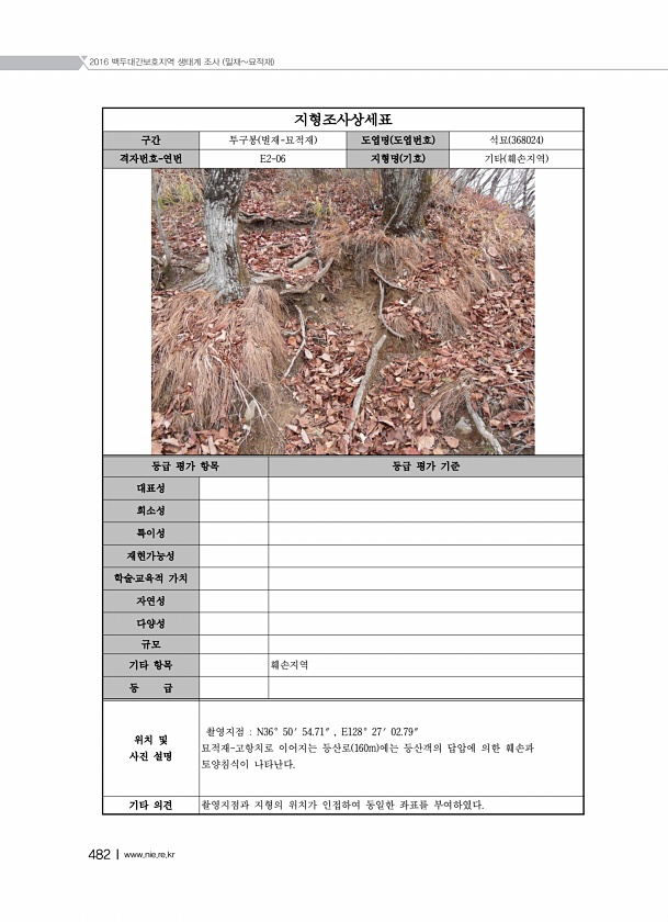 2016 백두대간보호지역 생태계 조사 밀재묘적재 482Ⅰwww.nie.re.kr 지형조사상세표 구간 투구봉 벌재-묘적재 도엽명 도엽번호 석묘 368024 격자번호-연번 E2-06 지형명 기호 기타 훼손지역 등급 평가 항목 등급 평가 기준 대표성 희소성 특이성 재현가능성 학술?교육적 가치 자연성 다양성 규모 기타 항목 훼손지역 등 급 위치 및 사진 설명 촬영지점 N36° 50′ 54.71″ , E128° 27′ 02.79″ 묘적재고항치로 이어지는 등산로 160m 에는 등산객의 답압에 의한 훼손과 토양침식이 나타난다. 기타 의견 촬영지점과 지형의 위치가 인접하여 동일한 좌표를부여하였다.