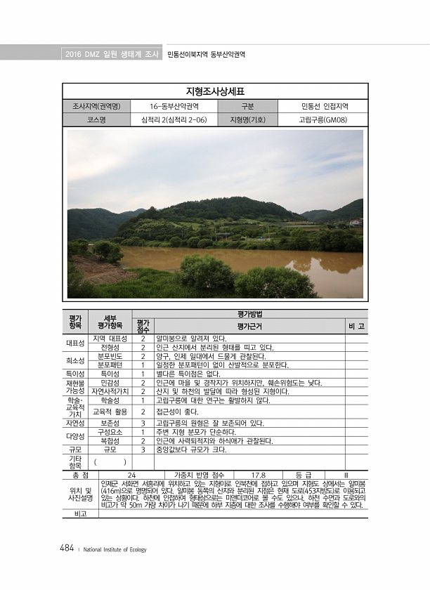 2016 DMZ 일원 생태계 조사 민통선이북지역 동부산악권역 484 ? National Institute of Ecology 지형조사상세표 조사지역 권역명 16-동부산악권역 구분 민통선 인접지역 코스명 심적리 2 심적리 2-06 지형명 기호 고립구릉 GM08 평가 항목 세부 평가항목 평가방법 평가 점수 평가근거 비 고 대표성 지역 대표성 2 알미봉으로 알려져 있다. 전형성 2 인근 산지에서 분리된 형태를 띠고 있다. 희소성 분포빈도 2 양구, 인제 일대에서 드물게 관찰된다. 분포패턴 1 일정한 분포패턴이 없이 산발적으로 분포한다. 특이성 특이성 1 별다른 특이점은 없다. 재현불 가능성 민감성 2 인근에 마을 및 경작지가 위치하지만, 훼손위험도는 낮다. 자연사적가치 2 산지 및 하천의 발달에 따라 형성된 지형...