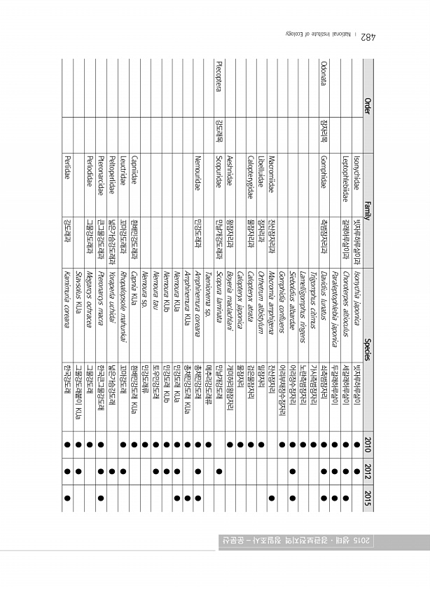 482 Order Family Species 2010 2012 2015 Isonychidae 빗자루하루살이과 Isonychia japonica 빗자루하루살이 ● ● Leptophlebiidae 갈래하루살이과 Choroterpes altioculus 세갈래하루살이 ● ● ● Paraleptophlebia japonica 두갈래하루살이 ● ● ● Odonata 잠자리목 Gomphidae 측범잠자리과 Davidius lunatus 쇠측범잠자리 ● ● ● Trigomphus citimus 가시측범잠자리 ● Lamelligomphus ringens 노란측범잠자리 ● Sieboldius albardae 어리장수잠자리 ● ● ● Gomphidia confluens 어리부채장수잠자리 ● Macromiidae 잔산잠자리과 ...