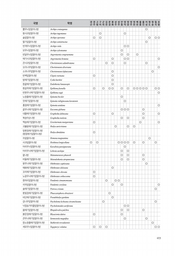493 뿔무늬잎말이나방 Archips crataeganus ○ 왕사과잎말이나방 Archips ingentanus ○ ○ 솔잎말이나방 Archips oporanus ○ ○ ○ ○ ○ 딸기잎말이나방 Archips semistructus ○ 번개무늬잎말이나방 Archips viola ○ ○ 모무늬잎말이나방 Archips xylosteanus ○ 반달무늬잎말이나방 Argyrotaenia congruentana ○ ○ ○ 애기사과잎말이나방 Argyrotaenia liratana ○ ○ ○ ○ ○ 큰사과잎말이나방 Choristoneura adumbratana ○ ○ ○ ○ 오리나무잎말이나방 Choristoneura diversana ○ 소귀나무잎말이나방 Choristoneura lafauryana ○ ○ 반백잎말이나방...