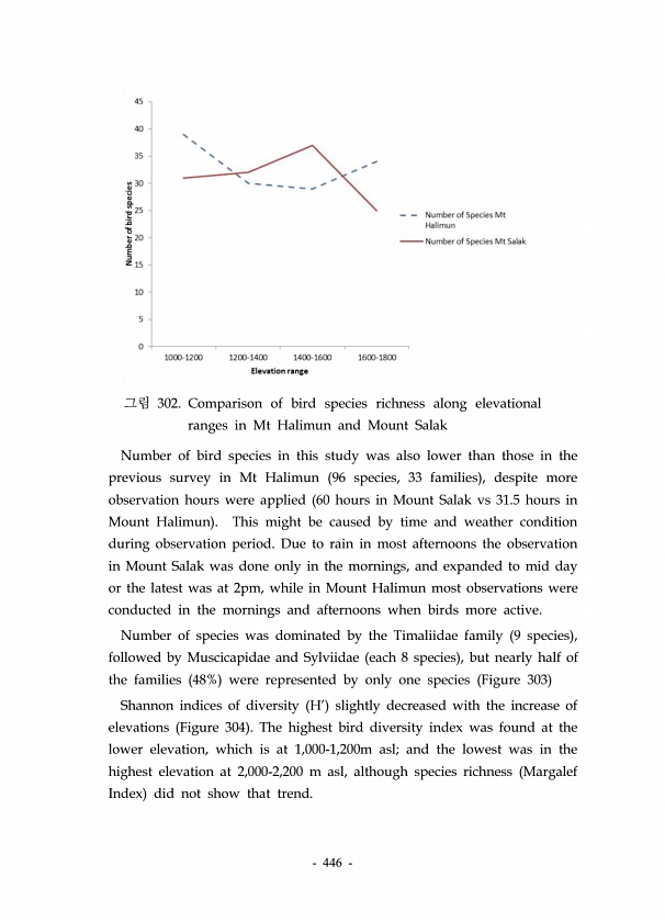 446 그림 302. Comparison of bird species richness along elevational ranges in Mt Halimun and Mount Salak Number of bird species in this study was also lower than those in the previous survey in Mt Halimun 96 species, 33 families , despite more observation hours were applied 60 hours in Mount Salak vs 31.5 hours in Mount Halimun This might be caused by time and weather condition during observation pe...