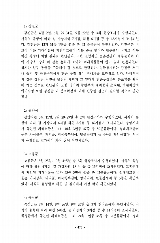 475 1 강진군 강진군은 4월 2일, 6월 2931일, 9월 22일 총 3회 현장조사가 수행되었다. 서식처 유형에 따라 길 가장자리 7지점, 하천 6지점 등 총 18지점이 조사되었 다. 강진군은 12과 31속 1변종 41종 총 42 분류군이 확인되었다. 강진군은 비 교적 적은 외래식물이 확인되었는데 이는 좁은 면적과 대부분이 산지로 이루 어진 특성에 의한 결과로 판단된다. 또한 전형적인 농촌경관이 대부분이며 이 에 개망초, 망초 와 같은 흔하게 보이는 외래식물들이 빈도 높게 관찰되었다. 하지만 일부 종들을 주목해야 할 것으로 판단된다. 털물참새피는 강진군 저지 대 습지 및 하천주위에서 단순 우점 하여 생태계를 교란하고 있다. 양미역취 의 경우 강진군 강진읍 탐진강 제방과 그 일대에 단순우점하며 분포역을 확...