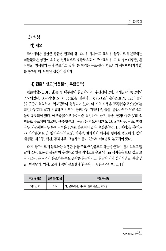 II. 조사결과 www.nie.re.kr ?481 3 조사지역은 신안군 팔금면 진고리 산 104 에 위치하고 있으며, 불무기도에 분포하는 식물군락은 상관에 의하면 전체적으로 칡군락으로 이루어졌으며, 그 외 청미래덩굴, 환 삼덩굴, 멍석딸기 등의 분포하고 있다. 본 지역은 목포-흑산 항로간의 시아바다 지역명 를 통과할 때, 나탄난 상징적 섬이다. , 현존식생도 2018 년 는 섬 대부분이 칡군락이며, 우산잔디군락, 억새군락, 쑥군락이 조사되었다. 조사지역 15 × 15 ㎡ 은 불무기도 65 도 34° 49′49.8″N, 126° 03′ 32.0E 에 위치하며, 억새군락이 형성되어 있다. 이 지역 식생은 교목층 수고 9m 에는 떡갈나무 피도 4 가 우점하고 있으며, 굴피나무, 자귀나무, 곰솔, 졸참나무가 90%...