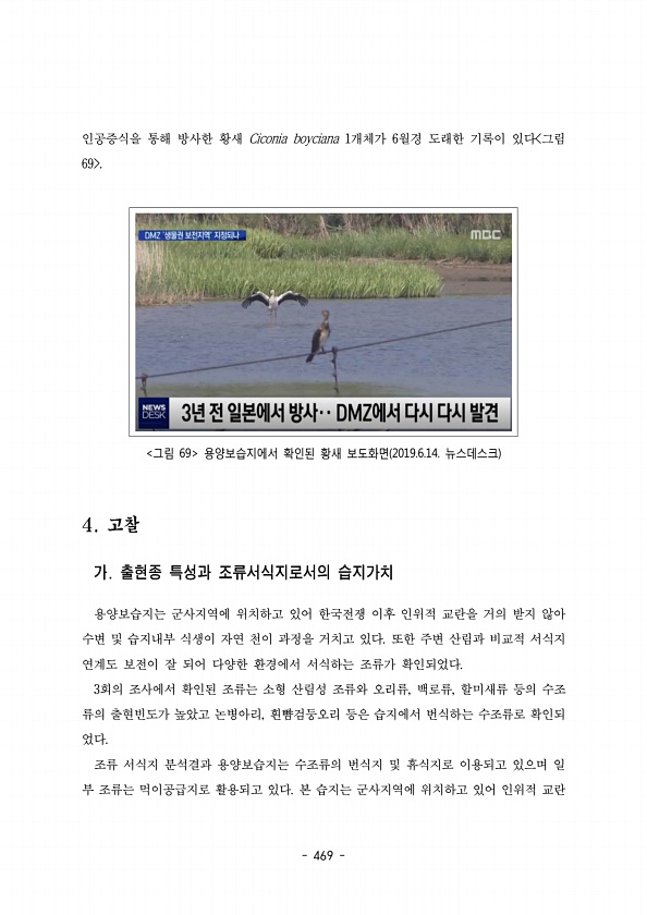 469 인공증식을 통해 방사한 황새 Ciconia boyciana 1 6 개체가 월경 도래한 기록이 있다 그림 69 그림 69 용양보습지에서 확인된 황새 보도화면 2019.6.14. 뉴스데스크 용양보습지는 군사지역에 위치하고 있어 한국전쟁 이후 인위적 교란을 거의 받지 않아 수변 및 습지내부 식생이 자연 천이 과정을 거치고 있다 또한 주변 산림과 비교적 서식지 연계도 보전이 잘 되어 다양한 환경에서 서식하는 조류가 확인되었다. 3회의 조사에서 확인된 조류는 소형 산림성 조류와 오리류 백로류 할미새류 등의 수조 , , 류의 출현빈도가 높았고 논병아리 흰뺨검둥오리 등은 습지에서 번식하는 수조류로 확인되 , 었다. 조류 서식지 분석결과 용양보습지는 수조류의 번식지 및 휴식지로 이용되고 있으며 일 부 조류는 먹이공...