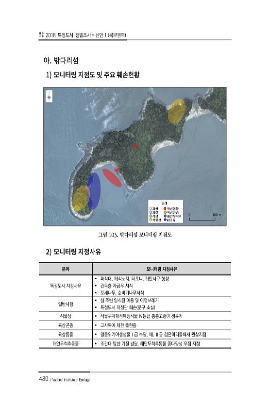 2018 특정도서 정밀조사 신안 1 북부권역 480 ? National Institute of Ecology 1 그림 103. 밖다리섬 모니터링 지점도 2 분야 모니터링 지정사유 특정도서 지정사유 ? 파식대, 해식노치, 타포니, 해안사구 형성 ? 관목층 자금우 서식 ? 모새나무, 순비기나무서식 일반사항 ? 섬 주변 양식장 이용 및 어업쓰레기 ? 특정도서 지정판 훼손 문구 소실 식물상 ? 식물구계학적특정식물 Ⅳ등급 층층고랭이 생육지 육상곤충 ? 고사목에 대한 출현종 육상동물 ? 멸종위기야생생물Ⅰ급 수달, 매, Ⅱ급 검은머리물떼새 관찰지점 해안무척추동물 ? 조간대 암반 기질 발달, 해안무척추동물 종다양성 우점지점