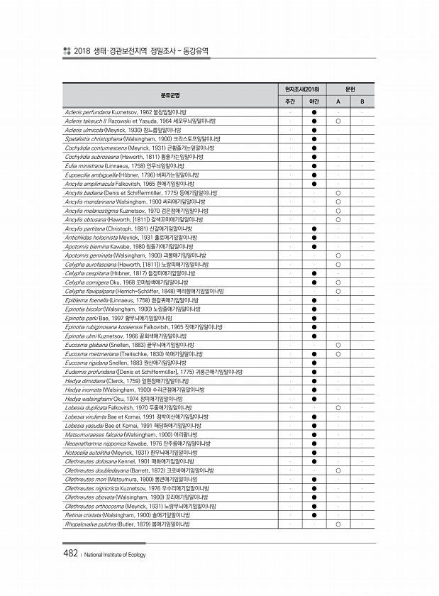 2018 생태·경관보전지역 정밀조사 동강유역 482 ? National Institute of Ecology 분류군명 현지조사 2018 문헌 주간 야간 A B Acleris perfundana Kuznetsov, 1962 물참잎말이나방 ● Acleris takeuchⅡ Razowski et Yasuda, 1964 세모무늬잎말이나방 ● ○ Acleris ulmicola Meyrick, 1930 참느릅잎말이나방 ● Spatalistis christophana Walsingham, 1900 크리스토프잎말이나방 ● Cochylidia contumescens Meyrick, 1931 큰횡줄가는잎말이나방 ● Cochylidia subroseana Haworth, 181...
