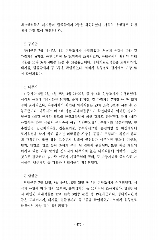 476 계교란식물은 돼지풀과 털물참새피 2종을 확인하였다. 서식처 유형별로 하천 에서 가장 많이 확인되었다. 5 구례군 구례군은 7월 1113일 1회 현장조사가 수행되었다. 서식처 유형에 따라 길 가장자리 6지점, 하천 4지점 등 14지점이 조사되었다. 구례군에서 확인된 외래 식물은 16과 39속 4변종 48종 총 52분류군이다. 생태계교란식물은 도깨비가지, 돼지풀, 털물참새피 등 3종을 확인하였다. 서식처 유형별로 길가에서 가장 많 이 확인되었다. 6 나주시 나주시는 4월 2일, 4월 25일 4월 2122일 등 총 6회 현장조사가 수행되었다. 서식처 유형에 따라 하천 24지점, 습지 11지점, 길 가장자리 7지점 등 총 48지 점이 조사되었다. 나주시에서 확인된 외래식물은 23과 55속 3변종 74종 총 ...