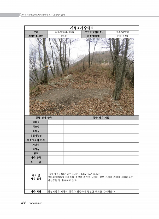 2016 백두대간보호지역 생태계 조사 추풍령밀재 486Ⅰwww.nie.re.kr 지형조사상세표 구간 청화산 늘재-밀재 도엽명 도엽번호 삼송 367082 격자번호-연번 E8-01 지형명 기호 기타 안부 등급 평가 항목 등급 평가 기준 대표성 희소성 특이성 재현가능성 학술?교육적 가치 자연성 다양성 규모 기타 항목 등 급 위치 및 사진 설명 촬영지점 N36° 37′ 31.85″ , E127° 55′ 55.13″ 갓바위재 770m 산정부를 촬영한 것으로 나지가 일부 드러난 지역을 제외하고는 자연성을 잘 유지하고 있다. 기타 의견 촬영지점과 지형의 위치가 인접하여 동일한 좌표를부여하였다.
