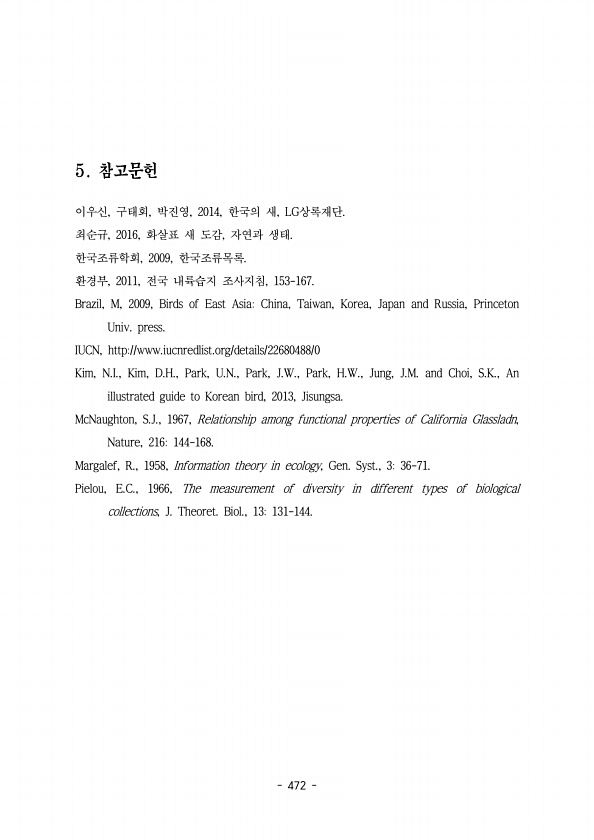 472 이우신 구태회 박진영 한국의 새 상록재단 , , , 2014, , LG 최순규 화살표 새 도감 자연과 생태 , 2016, , 한국조류학회 한국조류목록 , 2009, 환경부 전국 내륙습지 조사지침 , 2011, , 153-167. Brazil, M, 2009, Birds of East AsiaChina, Taiwan, Korea, Japan and Russia, Princeton Univ. press. IUCN, http//www.iucnredlist.org/details/22680488/0 Kim, N.I., Kim, D.H., Park, U.N., Park, J.W., Park, H.W., Jung, J.M. and Choi, S.K., An illustrated guide to Korean bir...