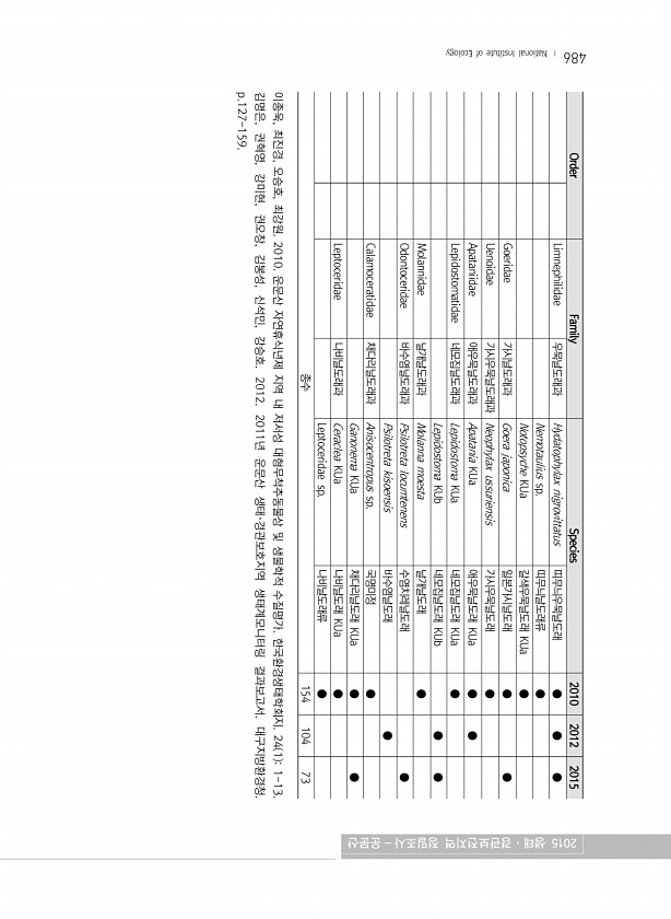 486 Order Family Species 2010 2012 2015 Limnephilidae 우묵날도래과 Hydatophylax nigrovittatus 띠무늬우묵날도래 ● ● ● Nemotaulius sp. 띠무늬날도래류 ● Notopsyche KUa 갈색우묵날도래 KUa ● Goeridae 가시날도래과 Goera japonica 일본가시날도래 ● ● Uenoidae 가시우묵날도래과 Neophylax ussuriensis 가시우묵날도래 ● Apataniidae 애우묵날도래과 Apatania KUa 애우묵날도래 KUa ● ● Lepidostomatidae 네모집날도래과 Lepidostoma KUa 네모집날도래 KUa ● Lepidostoma KUb 네모집날도래 KUb ● ● Molannidae 날개날도래...