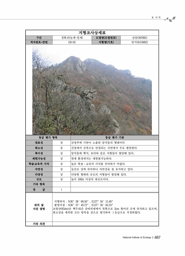 Ⅲ. 부 록 National Institute of EcologyⅠ487 지형조사상세표 구간 청화산 늘재-밀재 도엽명 도엽번호 삼송 367082 격자번호-연번 E8-02 지형명 기호 암석돔 GM02 등급 평가 항목 등급 평가 기준 대표성 상 산정부에 기반이 노출된 암석돔의 형태이다 희소성 중 산정에서 산복으로 연결되는 사면에서 주로 발달한다. 특이성 상 암석돔에 핵석, 토어와 같은 지형들이 발달해 있다. 재현가능성 상 현재 환경에서는 재현불가능하다. 학술?교육적 가치 상 높은 학술·교육적 가치를 부여하기 어렵다. 자연성 상 등산로 상에 위치하나 자연성을 잘 유지하고 있다. 다양성 상 다양한 형태와 규모의 지형들이 발달해 있다. 규모 상 높이 100m 이상의 대규모이다. 기타 항목 등 급 Ⅰ 위치 및 사진 설...