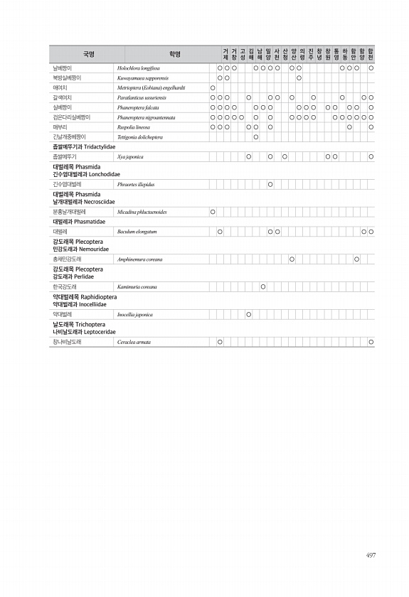 497 날베짱이 Holochlora longifssa ○ ○ ○ ○ ○ ○ ○ ○ ○ ○ ○ ○ ○ 북방실베짱이 Kuwayamaea sapporensis ○ ○ ○ 애여치 Metrioptera Eobiana engelhardti ○ 갈색여치 Paratlanticus ussuriensis ○ ○ ○ ○ ○ ○ ○ ○ ○ ○ ○ 실베짱이 Phaneroptera falcata ○ ○ ○ ○ ○ ○ ○ ○ ○ ○ ○ ○ ○ ○ ○ 검은다리실베짱이 Phaneroptera nigroantennata ○ ○ ○ ○ ○ ○ ○ ○ ○ ○ ○ ○ ○ ○ ○ ○ ○ 매부리 Ruspolia lineosa ○ ○ ○ ○ ○ ○ ○ ○ 긴날개중베짱이 Tettigonia dolichoptera ○ 좁쌀메뚜기과 Tridactylida...
