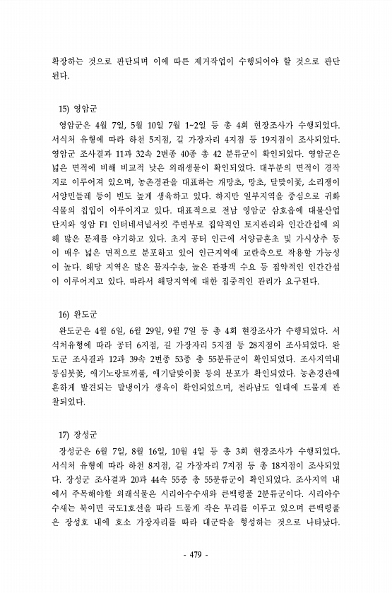 479 확장하는 것으로 판단되며 이에 따른 제거작업이 수행되어야 할 것으로 판단 된다. 15 영암군 영암군은 4월 7일, 5월 10일 7월 12일 등 총 4회 현장조사가 수행되었다. 서식처 유형에 따라 하천 5지점, 길 가장자리 4지점 등 19지점이 조사되었다. 영암군 조사결과 11과 32속 2변종 40종 총 42 분류군이 확인되었다. 영암군은 넓은 면적에 비해 비교적 낮은 외래생물이 확인되었다. 대부분의 면적이 경작 지로 이루어져 있으며, 농촌경관을 대표하는 개망초, 망초, 달맞이꽃, 소리쟁이 서양민들레 등이 빈도 높게 생육하고 있다. 하지만 일부지역을 중심으로 귀화 식물의 칩입이 이루어지고 있다. 대표적으로 전남 영암군 삼호읍에 대불산업 단지와 영암 F1 인터네셔널서킷 주변부로 집약적인 토지관리와 인간간...