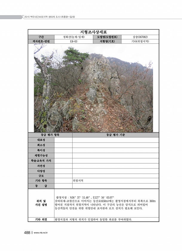 2016 백두대간보호지역 생태계 조사 추풍령밀재 488Ⅰwww.nie.re.kr 지형조사상세표 구간 청화산 늘재-밀재 도엽명 도엽번호 삼송 367082 격자번호-연번 E8-03 지형명 기호 기타 위험지역 등급 평가 항목 등급 평가 기준 대표성 희소성 특이성 재현가능성 학술?교육적 가치 자연성 다양성 규모 기타 항목 위험지역 등 급 위치 및 사진 설명 촬영지점 N36° 37′ 51.48″ , E127° 56′ 03.07″ 갓바위재-조항산으로 이어지는 등산로 650m 에는 촬영지점에서부터 북쪽으로 360m 떨어진 지점까지 위험지역이 나타난다. 이 구간의 능선은 암석으로 되어있어 등산객들의 안전을 위한 위험안내 표지판과 로프 설치가 필요해 보인다. 기타 의견 촬영지점과 지형의 위치가 인접하여 동일한 좌표를부여하였...