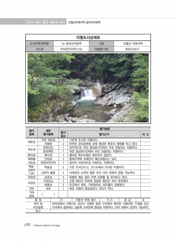 2016 DMZ 일원 생태계 조사 민통선이북지역 동부산악권역 490 ? National Institute of Ecology 지형조사상세표 조사지역 권역명 16-동부산악권역 구분 민통선 이북지역 코스명 두타연 두타연-03 지형명 기호 폭포 GS01 평가 항목 세부 평가항목 평가방법 평가 점수 평가근거 비 고 대표성 지역 대표성 1 기존에 조사된 지형이다. 전형성 2 하천의 경사급변점 상에 형성된 폭포의 형태를 띠고 있다. 희소성 분포빈도 1 전국적으로 하천 중상류구간에서 주로 관찰되는 지형이다. 분포패턴 1 하천 중상류구간에서 주로 관찰되는 지형이다. 특이성 특이성 1 별다른 특이사항은 확인되지 않았다. 재현불 가능성 민감성 3 통제구역에 속해있어 훼손위험도는 낮다. 자연사적가치 1 침식이 지속적으로 이뤄지...