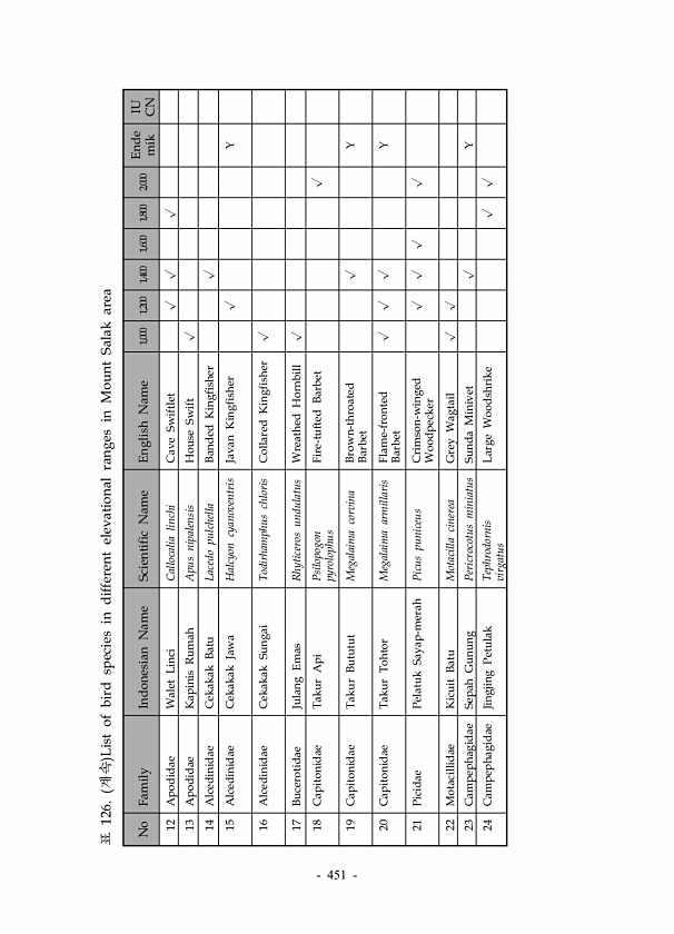 451 No Family Indonesian Name Scientific Name English Name 1,000 1,200 1,400 1,600 1,800 2,000 Ende mik CN IU 12 Apodidae Walet Linci Callocalia linchi Cave Swiftlet √ √ √ 13 Apodidae Kapinis Rumah Apus nipalensis House Swift √ 14 Alcedinidae Cekakak Batu Lacedo pulchella Banded Kingfisher √ 15 Alcedinidae Cekakak Jawa Halcyon cyanoventris Javan Kingfisher √ Y 16 Alcedinidae Cekakak Sungai Todirha...
