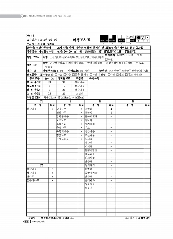 2018 DMZ 일원 생태계 조사 민통선이북지역 중부산악권역 490 ? National Institute of Ecology No 12 조사일자 2018년 5월 18일 조사자 식생조사표 군락명층층나무 조사지역산양리 코스 식생상관낙엽활엽수림 면적10×10 ㎡ 위·경도 GPS 38°1411.50N, 127°4026.04E 해발302m 지형□산정□능선□사면 □상□중□하 ?계곡□평지 미세지형?평면 □돌출 □함몰 □요철 방위15° 토양?갈색삼림토 □적황색삼림토 □암적색삼림토 □회갈색삼림토 □침식토 □미숙토 □암쇄토 경사7° 낙엽부식층3 cm 암석노출25% 이하 암석권?화성암□퇴적암□변성암 화강암 보전등급Ⅱ 수분조건□과습 □약습 ?중용 □약건 □과건 토성□사토 ?양토 □식토 사질토 층위구분 높이 m 식피율 % 우점종 ...