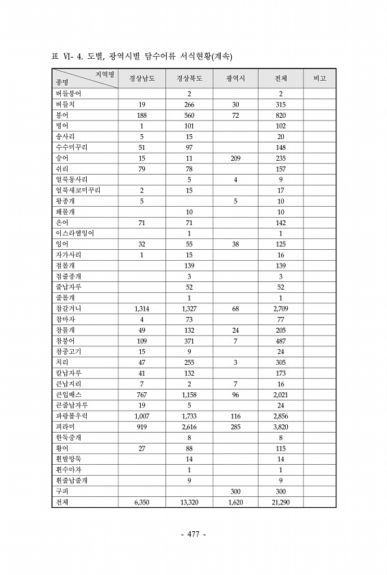 표 Ⅵ- 4. 도별, 광역시별 담수어류 서식현황 계속 지역명 종명 경상남도 경상북도 광역시 전체 비고 버들붕어 2 2 버들치 19 266 30 315 붕어 188 560 72 820 빙어 1 101 102 송사리 5 15 20 수수미꾸리 51 97 148 숭어 15 11 209 235 쉬리 79 78 157 얼룩동사리 5 4 9 얼룩새코미꾸리 2 15 17 왕종개 5 5 10 왜몰개 10 10 은어 71 71 142 이스라엘잉어 1 1 잉어 32 55 38 125 자가사리 1 15 16 점몰개 139 139 점줄종개 3 3 줄납자루 52 52 줄몰개 1 1 참갈겨니 1,314 1,327 68 2,709 참마자 4 73 77 참몰개 49 132 24 205 참붕어 109 371 7 487 참중고기 15 9 2...