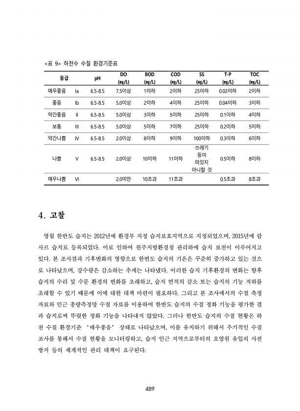 489 등급 pH DO ㎎/L BOD ㎎/L COD ㎎/L SS ㎎/L T-P ㎎/L TOC ㎎/L 매우좋음 Ia 6.5-8.5 7.5이상 1이하 2이하 25이하 0.02이하 2이하 좋음 Ib 6.5-8.5 5.0이상 2이하 4이하 25이하 0.04이하 3이하 약간좋음 II 6.5-8.5 5.0이상 3이하 5이하 25이하 0.1이하 4이하 보통 III 6.5-8.5 5.0이상 5이하 7이하 25이하 0.2이하 5이하 약간나쁨 IV 6.5-8.5 2.0이상 8이하 9이하 100이하 0.3이하 6이하 나쁨 V 6.5-8.5 2.0이상 10이하 11이하 쓰레기 등이 떠있지 아니할 것 0.5이하 8이하 매우나쁨 VI 2.0미만 10초과 11초과 0.5초과 8초과 표 9 하천수 수질 환경기준표 4. 고찰 영월 한반도...