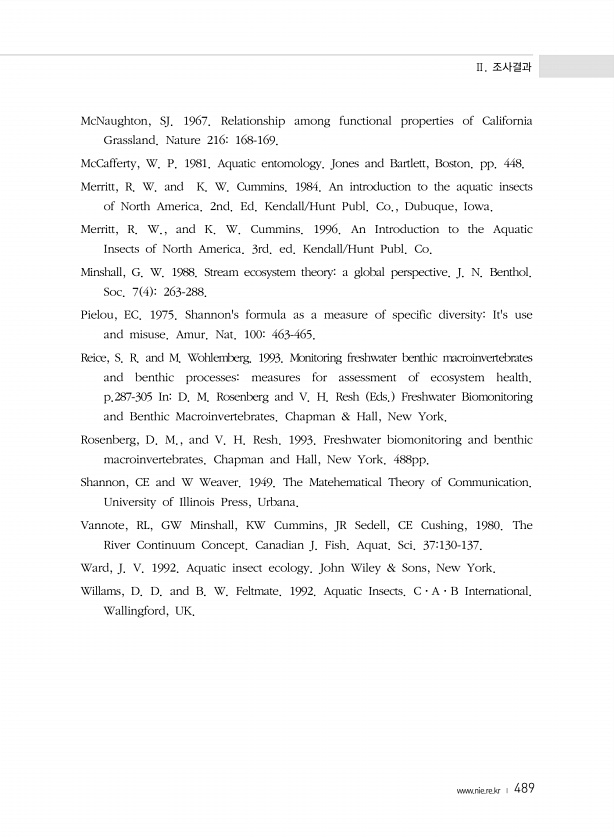Ⅱ. 조사결과 www.nie.re.kr ? 489 McNaughton, SJ. 1967. Relationship among functional properties of California Grassland. Nature 216168-169. McCafferty, W. P. 1981. Aquatic entomology. Jones and Bartlett, Boston. pp. 448. Merritt, R. W. and K. W. Cummins. 1984. An introduction to the aquatic insects of North America. 2nd. Ed. Kendall/Hunt Publ. Co., Dubuque, Iowa. Merritt, R. W., and K. W. Cummins. 1996...