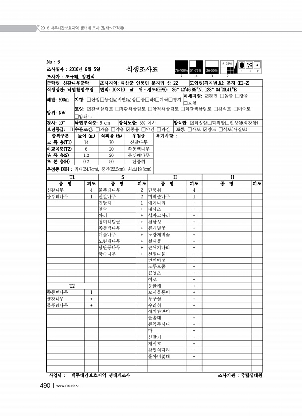 2016 백두대간보호지역 생태계 조사 밀재묘적재 490Ⅰwww.nie.re.kr No 6 조사일자 2016년 6월 5일 조사자 조규태, 정진석 식생조사표 군락명신갈나무군락 조사지역괴산군 연풍면 분지리 산 22 도엽명 격자번호 문경 E2-2 식생상관낙엽활엽수림 면적10×10 ㎡ 위·경도 GPS 36° 4246.85N, 128° 0423.41E 해발900m 지형□산정□능선?사면 ?상□중□하 □계곡□평지 미세지형?평면 □돌출 □함몰 □요철 방위NW 토양?갈색삼림토 □적황색삼림토 □암적색삼림토 □회갈색삼림토 □침식토 □미숙토 □암쇄토 경사10° 낙엽부식층9 cm 암석노출5% 이하 암석권?화성암□퇴적암□변성암 화강암 보전등급Ⅱ 수분조건□과습 □약습 ?중용 □약건 □과건 토성□사토 ?양토 □식토 사질토 층위구분 높이 ...