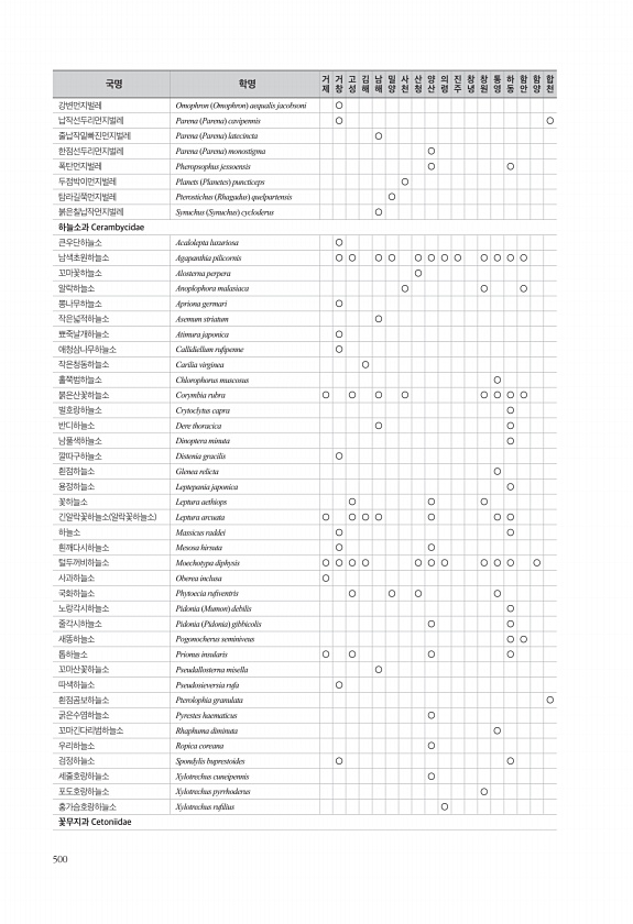 500 강변먼지벌레 Omophron Omophron aequalis jacobsoni ○ 납작선두리먼지벌레 Parena Parena cavipennis ○ ○ 줄납작밑빠진먼지벌레 Parena Parena latecincta ○ 한점선두리먼지벌레 Parena Parena monostigma ○ 폭탄먼지벌레 Pheropsophus jessoensis ○ ○ 두점박이먼지벌레 Planets Planetes puncticeps ○ 탐라길쭉먼지벌레 Pterostichus Rhagadus quelpartensis ○ 붉은칠납작먼지벌레 Synuchus Synuchus cycloderus ○ 하늘소과 Cerambycidae 큰우단하늘소 Acalolepta luxuriosa ○ 남색초원하늘소 Agapanthia pilicor...