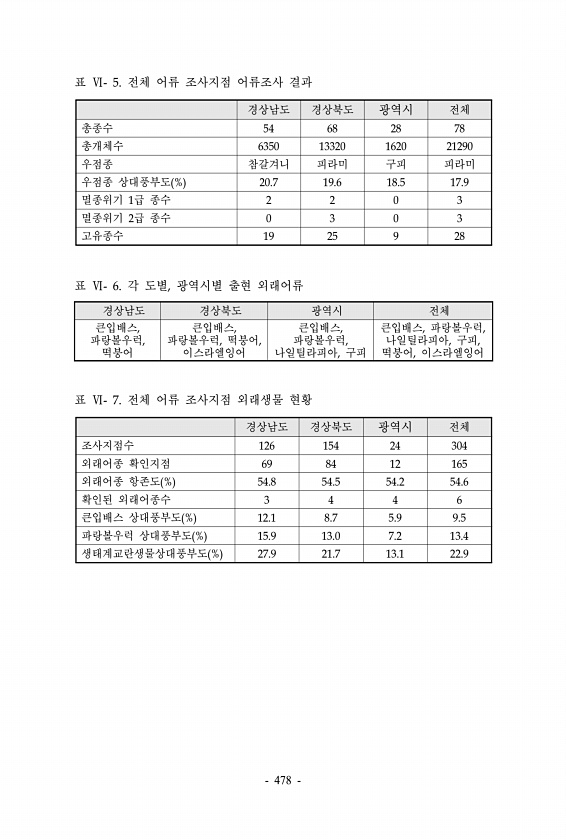 표 Ⅵ- 5. 전체 어류 조사지점 어류조사 결과 경상남도 경상북도 광역시 전체 총종수 54 68 28 78 총개체수 6350 13320 1620 21290 우점종 참갈겨니 피라미 구피 피라미 우점종 상대풍부도 % 20.7 19.6 18.5 17.9 멸종위기 1급 종수 2 2 0 3 멸종위기 2급 종수 0 3 0 3 고유종수 19 25 9 28 표 Ⅵ- 6. 각 도별, 광역시별 출현 외래어류 경상남도 경상북도 광역시 전체 큰입배스, 파랑볼우럭, 떡붕어 큰입배스, 파랑볼우럭, 떡붕어, 이스라엘잉어 큰입배스, 파랑볼우럭, 나일틸라피아, 구피 큰입배스, 파랑볼우럭, 나일틸라피아, 구피, 떡붕어, 이스라엘잉어 표 Ⅵ- 7. 전체 어류 조사지점 외래생물 현황 경상남도 경상북도 광역시 전체 조사지점수 126 154 24...