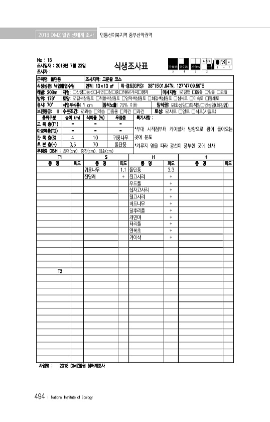 2018 DMZ 일원 생태계 조사 민통선이북지역 중부산악권역 494 ? National Institute of Ecology No 16 조사일자 2018년 7월 23일 조사자 식생조사표 군락명돌단풍 조사지역고둔골 코스 식생상관낙엽활엽수림 면적10×10 ㎡ 위·경도 GPS 38°1501.94N, 127°4709.59E 해발208m 지형□산정□능선□사면 □상□중□하 ?계곡□평지 미세지형?평면 □돌출 □함몰 □요철 방위179° 토양?갈색삼림토 □적황색삼림토 □암적색삼림토 □회갈색삼림토 □침식토 □미숙토 □암쇄토 경사70° 낙엽부식층1 cm 암석노출75% 이하 암석권?화성암□퇴적암□변성암 화강암 보전등급Ⅱ 수분조건?과습 □약습 □중용 □약건 □과건 토성?사토 □양토 □식토 사질토 층위구분 높이 m 식피율 % 우점종...