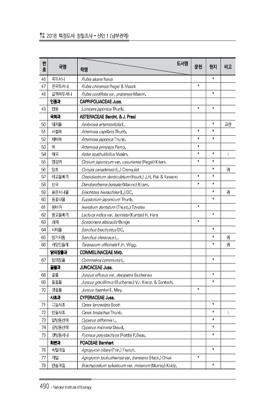 2018 특정도서 정밀조사 신안 1 남부권역 490 ? National Institute of Ecology 번 호 국명 도서명 학명 문헌 현지 비고 46 꼭두서니 Rubia akane Nakai * 47 큰꼭두서니 Rubia chinensis Regel & Maack * 48 갈퀴꼭두서니 Rubia cordifolia var. pratensis Maxim. * 인동과 CAPRIFOLIACEAE Juss. 49 인동 Lonicera japonica Thunb. * * 국화과 ASTERACEAE Bercht. & J. Presl 50 돼지풀 Ambrosia artemisiifolia L. * 교란 51 사철쑥 Artemisia capillaris Thunb. * * 52 제비쑥 Artemisia japonic...