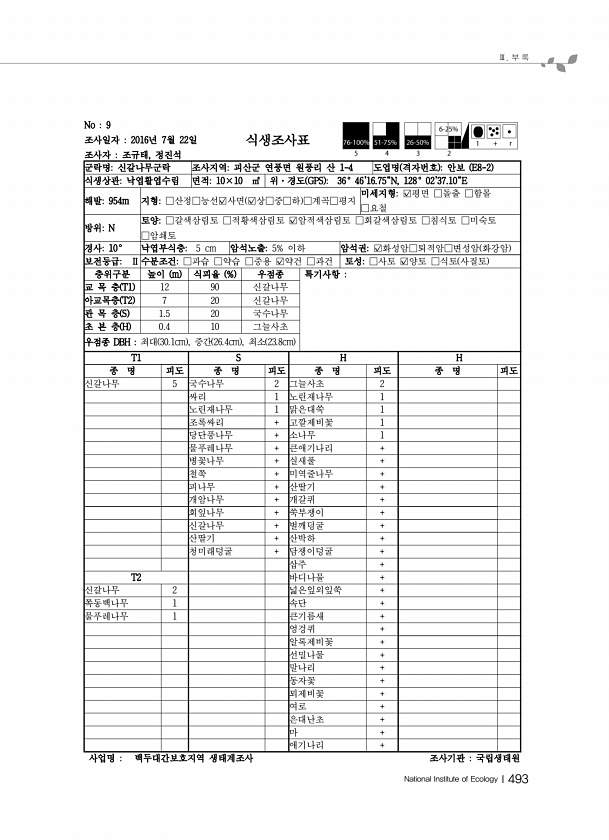 Ⅲ. 부 록 National Institute of EcologyⅠ493 No 9 조사일자 2016년 7월 22일 조사자 조규태, 정진석 식생조사표 군락명신갈나무군락 조사지역괴산군 연풍면 원풍리 산 1-4 도엽명 격자번호 안보 E8-2 식생상관낙엽활엽수림 면적10×10 ㎡ 위·경도 GPS 36° 4616.75N, 128° 0237.10E 해발954m 지형□산정□능선?사면 ?상□중□하 □계곡□평지 미세지형?평면 □돌출 □함몰 □요철 방위N 토양□갈색삼림토 □적황색삼림토 ?암적색삼림토 □회갈색삼림토 □침식토 □미숙토 □암쇄토 경사10° 낙엽부식층5 cm 암석노출5% 이하 암석권?화성암□퇴적암□변성암 화강암 보전등급Ⅱ 수분조건□과습 □약습 □중용 ?약건 □과건 토성□사토 ?양토 □식토 사질토 층위구분 높이 m 식...