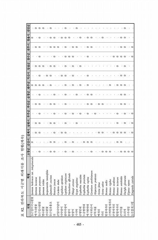 표 82. 전라북도 시군별 외래식물 조사 현황 계속 국명 학명 고창군 군산시 김제시 남원시 무주군 부안군 순창군 완주군 익산시 임실군 장수군 전주시 정읍시 진안군 둥근잎미국나팔꽃 Ipomoea hederacea var. integriuscula 0 0 0 애기나팔꽃 Ipomoea lacunosa 0 0 0 0 0 0 0 둥근잎나팔꽃 Ipomoea purpurea 0 0 0 0 0 0 0 0 0 0 0 0 0 별나팔꽃 Ipomoea triloba 0 0 0 선나팔꽃 Jacquemontia taminifolia 0 둥근잎유홍초 Quamoclit coccinea 0 0 0 0 0 0 0 0 0 0 갓 Brassica juncea 0 0 0 0 0 0 0 0 0 0 0 큰잎다닥냉이 Cardaria draba 0 다...