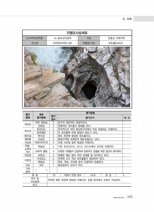 Ⅲ. 부록 www.nie.re.kr ? 495 지형조사상세표 조사지역 권역명 16-동부산악권역 구분 민통선 이북지역 코스명 두타연 두타연-08 지형명 기호 포트홀 GS03 평가 항목 세부 평가항목 평가방법 평가 점수 평가근거 비 고 대표성 지역 대표성 3 양구의 대표적인 관광지이다. 전형성 3 전형적인 포트홀의 형태를 띤다. 희소성 분포빈도 2 전국적으로 하천 중상류구간에서 주로 관찰되는 지형이다. 분포패턴 2 타 포트홀에 비해 발달의 정도가 크다. 특이성 특이성 3 폭포 측면에 형성된 포트홀이다. 재현불 가능성 민감성 3 통제구역에 속해있어 훼손위험도는 낮다. 자연사적가치 2 오랜 시간에 걸쳐 형성된 지형이다. 학술· 교육적 가치 학술성 2 기존 조사 2010, 2012, 2014 에서 조사된 지형이다. ...