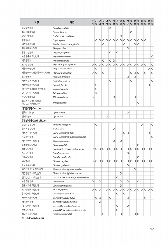 503 왕벼룩잎벌레 Ophrida spectabilis ○ 홍다리벼잎벌레 Oulema dilutipes ○ 삼각산잎벌레 Pachybrachis scriptidorsum ○ 콩잎벌레 Pagria signata ○ ○ ○ ○ ○ ○ ○ ○ ○ ○ ○ ○ ○ ○ ○ 세점박이잎벌레 Paridea Paraulaca angulicollis ○ ○ ○ ○ 혹발톱벼룩잎벌레 Philopona vibex ○ 황갈색잎벌레 Phygasia fulvipennis ○ ○ 노랑등줄벼룩잎벌레 Phyllotreta rectilineata ○ 벼룩잎벌레 Phyllotreta striolata ○ ○ ○ 밤나무잎벌레 Physosmaragdina nigrifrons ○ ○ ○ ○ ○ ○ ○ ○ ○ ○ ○ ○ ○ ○ ○ ○ ○ 버들꼬마잎벌레 P...
