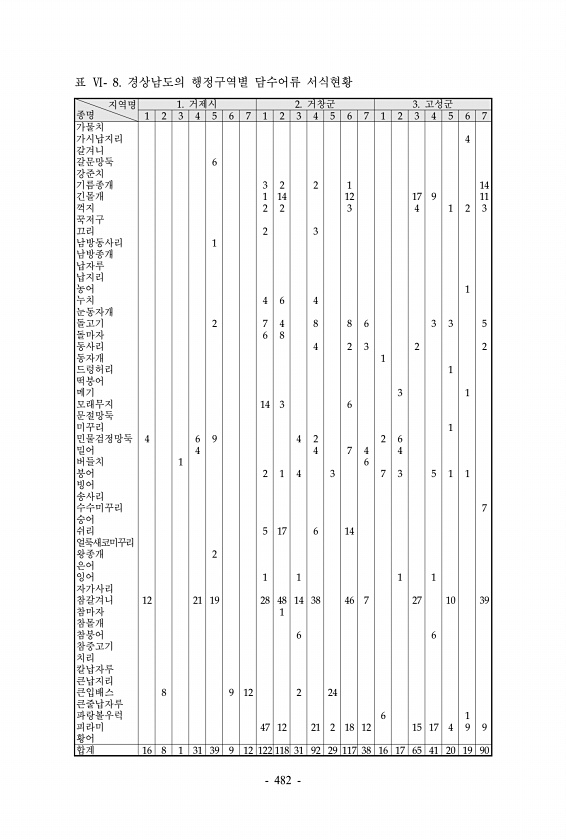 표 Ⅵ- 8. 경상남도의 행정구역별 담수어류 서식현황 지역명 종명 1. 거제시 2. 거창군 3. 고성군 1 2 3 4 5 6 7 1 2 3 4 5 6 7 1 2 3 4 5 6 7 가물치 가시납지리 4 갈겨니 갈문망둑 6 강준치 기름종개 3 2 2 1 14 긴몰개 1 14 12 17 9 11 꺽지 2 2 3 4 1 2 3 꾹저구 끄리 2 3 남방동사리 1 남방종개 납자루 납지리 농어 1 누치 4 6 4 눈동자개 돌고기 2 7 4 8 8 6 3 3 5 돌마자 6 8 동사리 4 2 3 2 2 동자개 1 드렁허리 1 떡붕어 메기 3 1 모래무지 14 3 6 문절망둑 미꾸리 1 민물검정망둑 4 6 9 4 2 2 6 밀어 4 4 7 4 4 버들치 1 6 붕어 2 1 4 3 7 3 5 1 1 빙어 송사리 수수미꾸리 7 ...