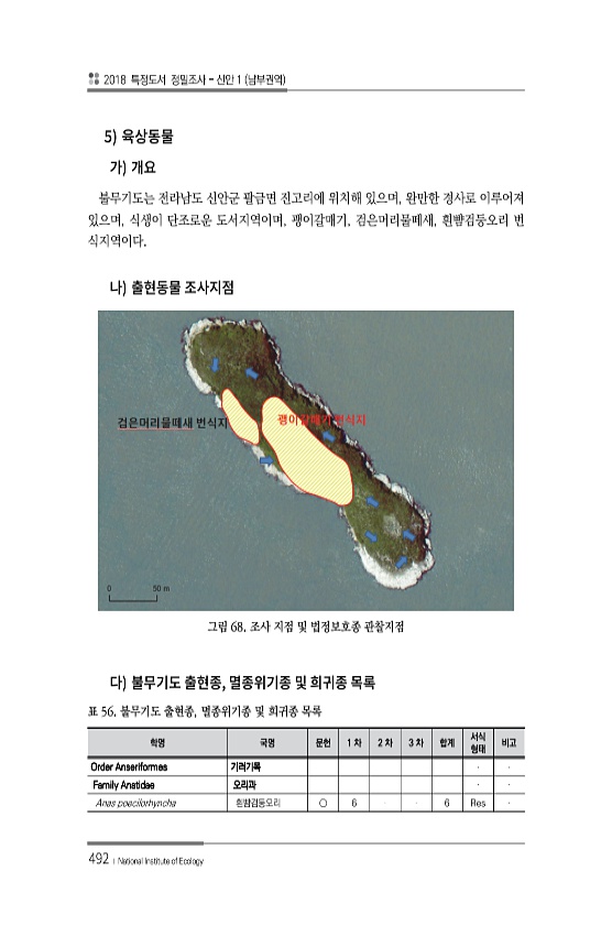 2018 특정도서 정밀조사 신안 1 남부권역 492 ? National Institute of Ecology 5 불무기도는 전라남도 신안군 팔금면 진고리에 위치해 있으며, 완만한 경사로 이루어져 있으며, 식생이 단조로운 도서지역이며, 괭이갈매기, 검은머리물떼새, 흰뺨검둥오리 번 식지역이다. 그림 68. 조사 지점 및 법정보호종 관찰지점 , 학명 국명 문헌 1 차 2 차 3 차 합계 서식 형태 비고 Order Anseriformes 기러기목 Family Anatidae 오리과 Anas poecilorhyncha 흰뺨검둥오리 ○ 6 6 Res 표 56. 불무기도 출현종, 멸종위기종 및 희귀종목록